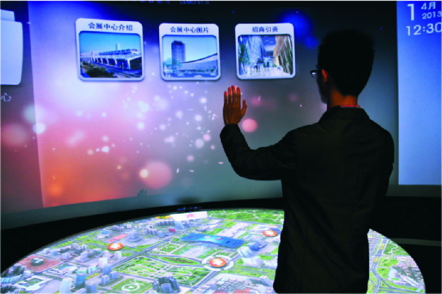 以計(jì)算機(jī)技術(shù)為核心的現(xiàn)代高科技手段生成逼真的三維圖像模型,借助投影顯示設(shè)備或其他顯示設(shè)備把計(jì)算機(jī)上的三維或四維圖形圖像模型顯示到臺面上 ……